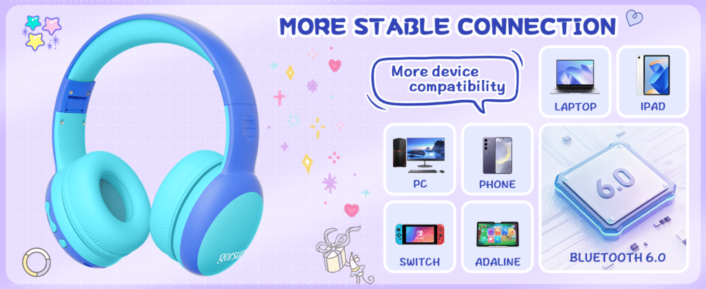 - 【EASY CONNECTION & BUILT-IN MIC】Stay connected with Bluetooth 6.0 for fast, stable pairing. These kids Bluetooth headphones include one-touch controls and a built-in HD microphone, perfect for online classes, homework, or chatting with friends and family.